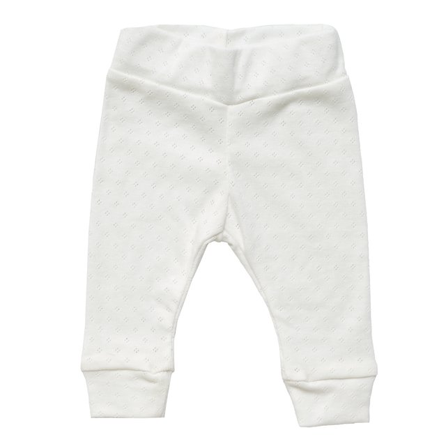 Legging gemaakt van een fijne katoenen stof met pointelle motiefjes. In de tailleboord van de legging zit een elastiek, zodat het broekje niet afzakt.